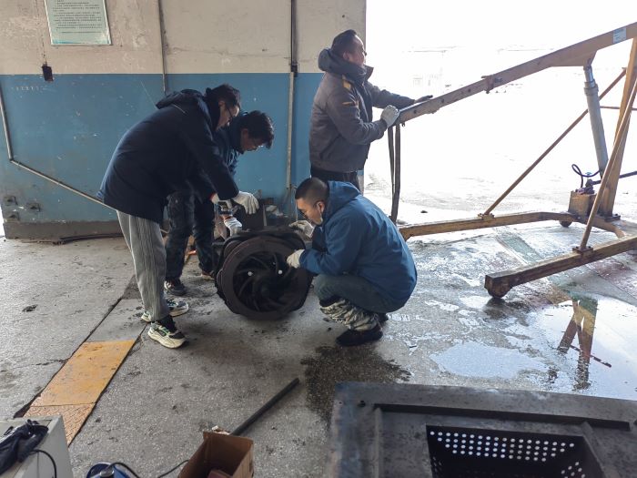 為了不耽誤生產(chǎn),2月25日,事業(yè)部組織員工對(duì)軸承進(jìn)行更換。由于大家都是第一次拆解渦流機(jī),比較生疏,而渦流機(jī)部件久已生銹,給拆解帶來(lái)了極大困難,副經(jīng)理葉舟帶領(lǐng)大家一起看圖紙,一起研究,邊學(xué)習(xí)、邊拆解,員工積極配合,一起發(fā)力,經(jīng)過(guò)6個(gè)小時(shí)的努力奮戰(zhàn),終于完成了軸承的更換。