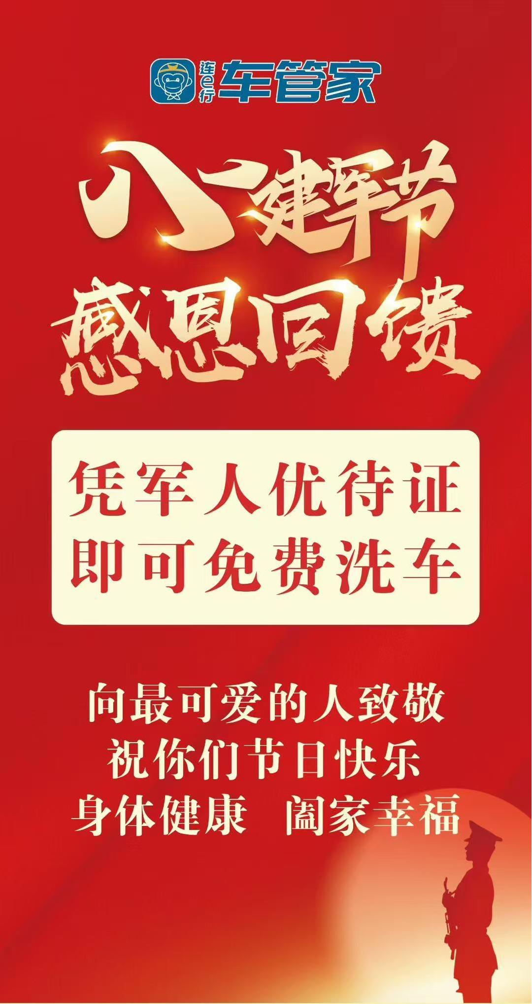 有一種擔(dān)當(dāng),叫保家衛(wèi)國(guó);有一種奉獻(xiàn),叫戎馬丹心。值此“八一”建軍節(jié)來(lái)臨之際,汽服公司“連e行”車(chē)管家以“紅色傳承 迎八一”為主題,特別推出擁軍專(zhuān)屬活動(dòng)——用細(xì)致服務(wù)致敬軍魂,以實(shí)際行動(dòng)傳承紅色基因,向每一位現(xiàn)役、退役軍人致以最崇高的敬意,讓尊崇與溫暖直抵心間。