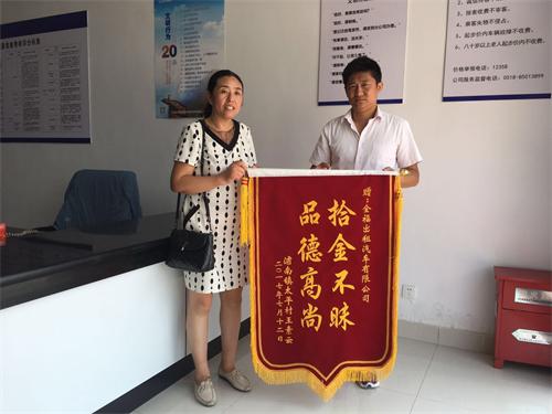 7月12日,港城市民張女士將一面印有“拾金不昧”的錦旗送到全福出租公司張德占的手中,以感謝他拾金不昧的善舉。